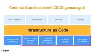 Das Dokument beschreibt die kontinuierliche Bereitstellung (CD) für Puppet Enterprise und adressiert spezifische Herausforderungen, die Sysadmins dabei haben, Puppet effektiv zu nutzen. CD für PE bietet eine automatisierte und skalierbare Lösung, die eine einfache Handhabung von Git integriert und gleichzeitig Best-Practice-Workflows, Tests sowie Rollouts bei der Infrastrukturverwaltung erleichtert. Es wird auf die Verfügbarkeit von Anleitungen und Support hingewiesen, um die Nutzung der Software weiter zu optimieren.