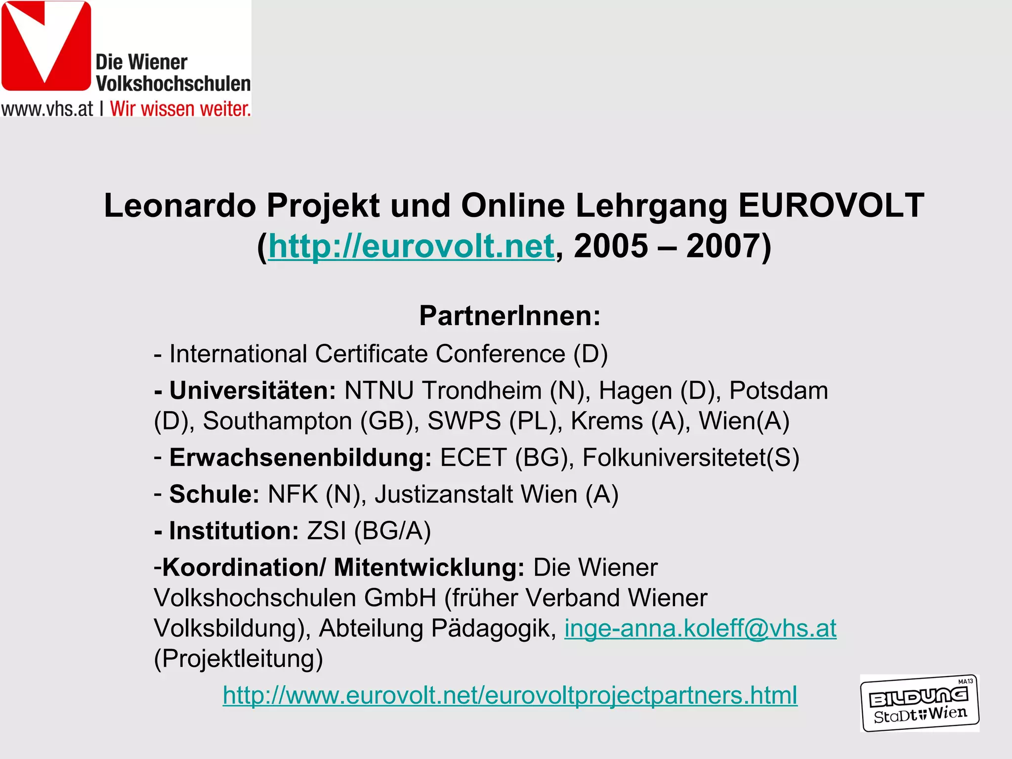 Das Eurovolt-Projekt bietet einen Online-Lehrgang zur sprachlichen und didaktischen Ausbildung in mehreren europäischen Ländern, unterstützt von Partnerinstitutionen wie Universitäten und Bildungseinrichtungen. Der Lehrgang umfasst multikulturelle und genderorientierte Lernansätze, nutzt verschiedene Online-Tools und ermöglicht individuelles sowie kollaboratives Lernen. Absolventen erhalten ein Eurovolt-Zertifikat oder ein Diplom, das die Kompetenzen im Sprachunterricht bescheinigt.