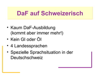 Das Dokument behandelt die sprachliche Situation in der Schweiz, insbesondere die Verwendung von Dialekten im Vergleich zu Standarddeutsch und die Herausforderungen für Lernende der deutschen Sprache. Es wird auf die Diglossie und die Verwendung von Helvetismen hingewiesen, die in der Alltagssprache präsent sind. Zudem werden Konsequenzen für die Sprachvermittlung aufgezeigt, da viele Schweizer nicht gerne Hochdeutsch sprechen und geeignete Lehrmittel fehlen.