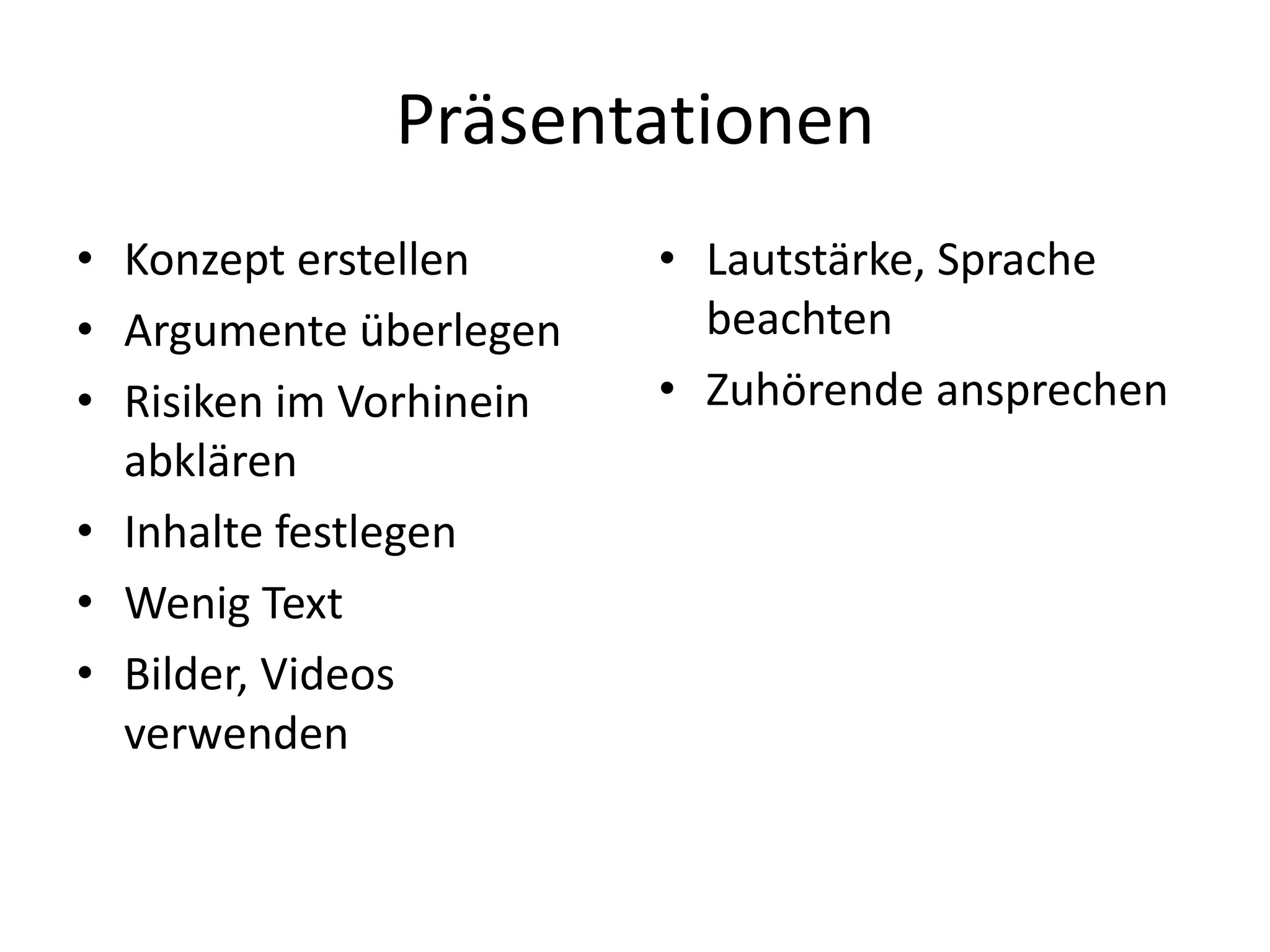 Das Dokument bietet eine Anleitung zur Erstellung von Präsentationen, betont die Bedeutung von Lautstärke und Sprache sowie das Überlegen von Argumenten. Es werden auch Aspekte wie die Identifikation von Risiken, die Ansprache des Publikums und die Festlegung der Inhalte hervorgehoben. Außerdem wird geraten, wenig Text zu verwenden und visuelle Elemente wie Bilder und Videos einzubinden.