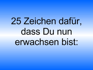 Das Dokument listet 25 Zeichen auf, die darauf hindeuten, dass man erwachsen geworden ist, wie z.B. die Verantwortung für Pflanzen, das Aufstehen um 6:00 Uhr und das Füttern des Hundes mit richtigem Futter. Es beschreibt auch Veränderungen im Denken und Verhalten, wie den Umgang mit sozialen Situationen und Alkohol. Am Ende wird ein Gefühl der Identifikation oder Verzweiflung ausgelöst, wenn man diese Merkmale bei sich selbst erkennt.