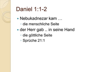 Das Dokument behandelt die biblischen Geschichten von Daniel und seinen Freunden in Babylon, die ihre Identität und ihren Glauben bewahren, während sie verschiedene Herausforderungen, einschließlich der Bedrohung durch Nebukadnezar und seiner goldenen Statue, gegenüberstehen. Es betont Themen wie treue Hingabe an Gott, die Bedeutung von Gebet und den Glauben trotz Widrigkeiten sowie die letztliche Belohnung durch Gott für ihre Loyalität. Die Geschichten sind sowohl lehrreich in Bezug auf die damaligen als auch auf zeitgenössische moralische und spirituelle Prinzipien.