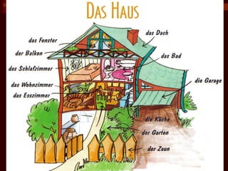 Das Dokument beschreibt die verschiedenen Teile und Räume eines Hauses, einschließlich Dach, Fenster, Tür, und spezifische Zimmer wie Küche, Schlafzimmer und Wohnzimmer. Es listet auch zusätzliche Bereiche wie Garage, Garten und Flur auf. Insgesamt gibt es eine klare Übersicht über die Struktur und die Räume eines Wohngebäudes.