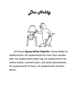 Mein Name ist Agung Adrian Nugraha und mein Hobby ist das Saubermachen. Ich putze jeden Tag zusammen mit meiner Mutter, meinem Vater und meiner Schwester, um unser Haus sauber und ordentlich zu halten. Dabei benutze ich unter anderem einen Besen.