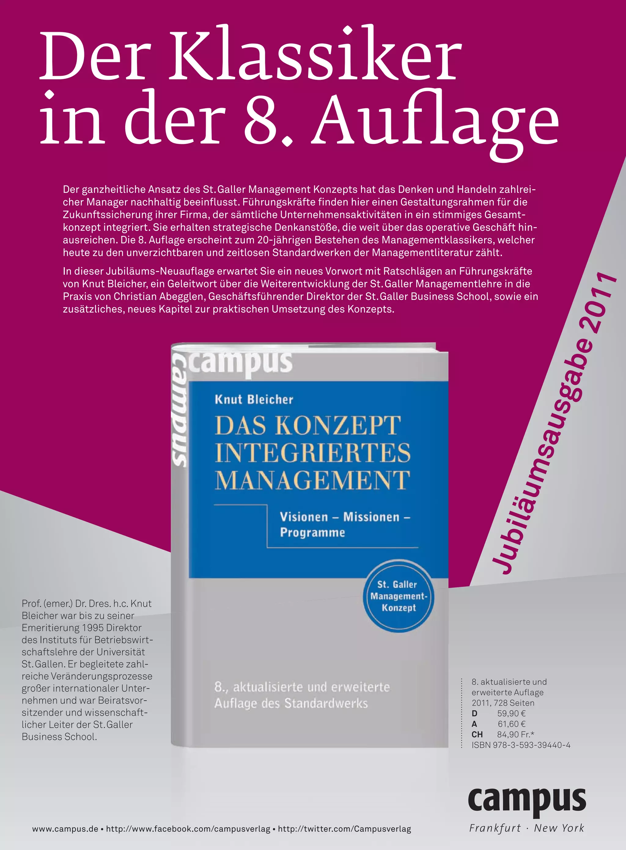 Die 8. Auflage des St. Galler Management Konzepts bietet Führungskräften einen integrativen Rahmen zur Zukunftssicherung ihres Unternehmens und enthält strategische Denkanstöße über das operative Geschäft hinaus. Zum 20-jährigen Jubiläum sind neue Vorworte und zusätzlich ein Kapitel zur praktischen Umsetzung des Konzepts enthalten. Das Werk gehört zu den zeitlosen Standardwerken der Managementliteratur.