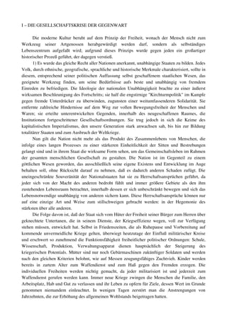 Das Dokument analysiert die gesellschaftlichen und politischen Krisen der Gegenwart im Kontext der Freiheit und der nationalen Unabhängigkeit, die zur Entstehung totalitärer Staaten und Konflikte geführt haben. Es beschreibt, wie der Imperialismus und die Herrschaftsansprüche nationaler Staaten zur Militarisierung der Gesellschaft und zum Verlust individueller Freiheiten geführt haben. Abschließend wird die Hoffnung auf eine europäische Einheit und die Stärkung der fortschrittlichen Kräfte nach der Niederlage Deutschlands als Weg zur Rettung der Kultur beschworen.