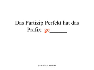 Das Dokument behandelt die Bildung und Form des Partizips Perfekt im Deutschen, einschließlich der Verwendung des Präfixes „ge-“. Es werden regelmäßige und unregelmäßige Verben sowie die Unterstützung durch die Hilfsverben „haben“ und „sein“ erläutert. Zudem werden spezifische Beispiele für die Anwendung im Perfekt gegeben.