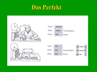 Das Dokument beschreibt die Verwendung des Perfekts in der deutschen Sprache, einschließlich der Bildung des Partizip Perfekt für schwache und starke Verben sowie trennbare und untrennbare Verben. Es enthält Beispiele für die Konjugation und den Gebrauch im Aussagesatz und Fragesatz. Zudem werden verschiedene Verben und deren Partizipien aufgelistet, um die Bildung von Perfektsätzen zu verdeutlichen.
