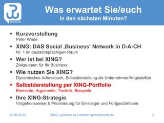 Das Dokument von Peter Wode bietet eine umfassende Einführung in die Nutzung von Xing, einem führenden sozialen Business-Netzwerk im deutschsprachigen Raum, einschließlich strategischer Tipps für die Kontaktverwaltung und Selbstdarstellung. Es beschreibt die Vorteile eines Xing-Portfolios, die Anforderungen an die Erstellung und Pflege sowie verschiedene Zielgruppen und Nutzungsmöglichkeiten. Abschließend wird betont, wie wichtig es ist, ein aktives und vollständiges Profil zu haben, um erfolgreich im Netzwerk agieren zu können.