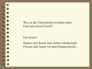 Das Dokument enthält eine Sammlung von Witzen und humorvollen Äußerungen über Frauen und deren vermeintliche Eigenschaften im Vergleich zu verschiedenen Tieren und Männern. Es spielt mit Klischees und stereotype Vorstellungen in einer provokanten und oft beleidigenden Weise. Die Witze thematisieren Beziehungen, Geschlechterrollen und die Wahrnehmung von Frauen in der Gesellschaft.