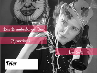 Das Dokument behandelt verschiedene Traditionen und Bräuche rund um die Silvesterfeier am Brandenburger Tor, einschließlich Sekt, Pyrotechnik und Aberglauben wie Bleigießen und das Springen von einem Stuhl. Es erwähnt auch typische Gastronomie wie Feuerzangenbowle und Glücksschweine sowie die Rolle von Silvester im deutschen Fernsehen, insbesondere die Wiederholung von 'Dinner for One'. Abschließend wird das neue Jahr 2014 begrüßt.