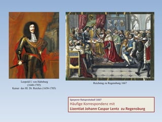 Das Dokument präsentiert Ereignisse und Berichte aus Speyer im Jahr 1667, einschließlich der politischen, sozialen und kulturellen Aktivitäten sowie Protokollen des Rats. Es behandelt die Auswirkungen der Pestepidemie, Hochzeiten, öffentliche Vergnügungen und die Gerichtsbarkeit. Wichtige historische Persönlichkeiten und deren Handlungen sowie die lokale Verwaltung werden ebenfalls thematisiert.