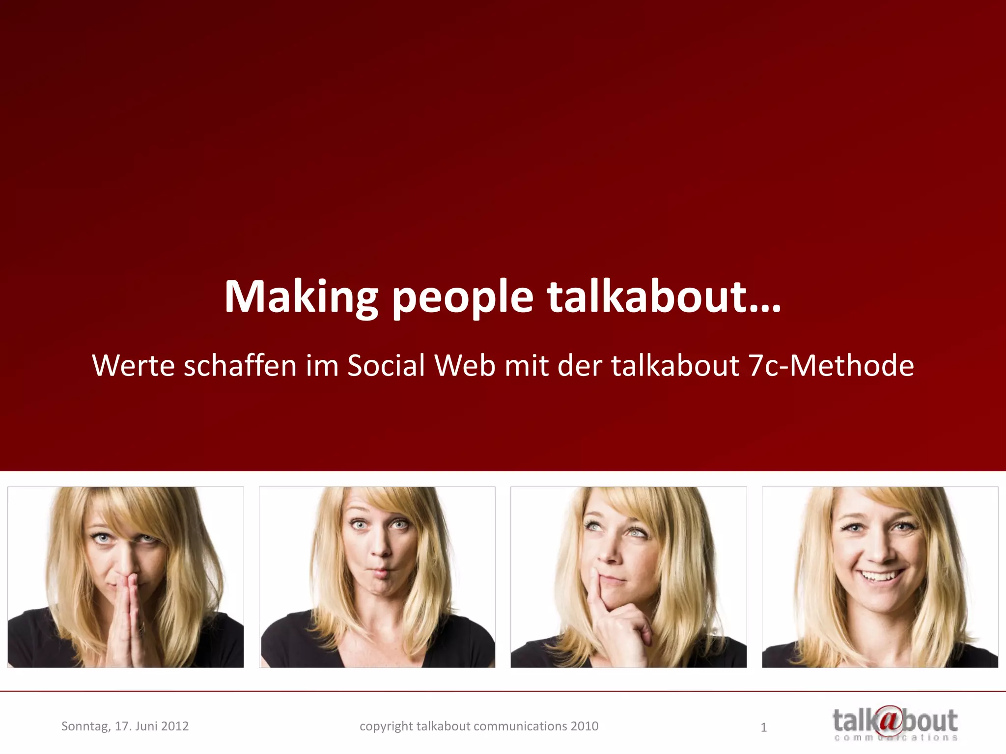 Das Dokument beschreibt die 7C-Methode von Talkabout Communications, die Unternehmen helfen soll, im Social Web Werte zu schaffen. Die Methode umfasst Schritte von 'Contribution' bis 'Conversion', die auf die Entwicklung einer Strategie für effektive Social Media Kommunikation abzielen. Ziel ist es, durch gezielte Planung, Kennzahlen und geschickte Vernetzung die Wirkung und Reichweite von Unternehmenskommunikation zu maximieren.