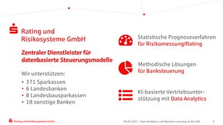 Die Rating und Risikosysteme GmbH bietet seit dem 04. Mai 2021 Data Analytics und Machine Learning für die Sparkassen-Finanzgruppe an und unterstützt über 400 Banken bei statistischen Prognosen für Risikomessung und KI-basierter Vertriebsunterstützung. Im Jahr 2020 nutzten mehr als 300 Sparkassen das Data-Analytics-Angebot, um gezielt Kundenwünsche zu erfüllen und Produkte zu empfehlen. Das Ziel hat sich durch die Corona-Pandemie nicht geändert, lediglich das Tempo der Umsetzung wurde beeinflusst.