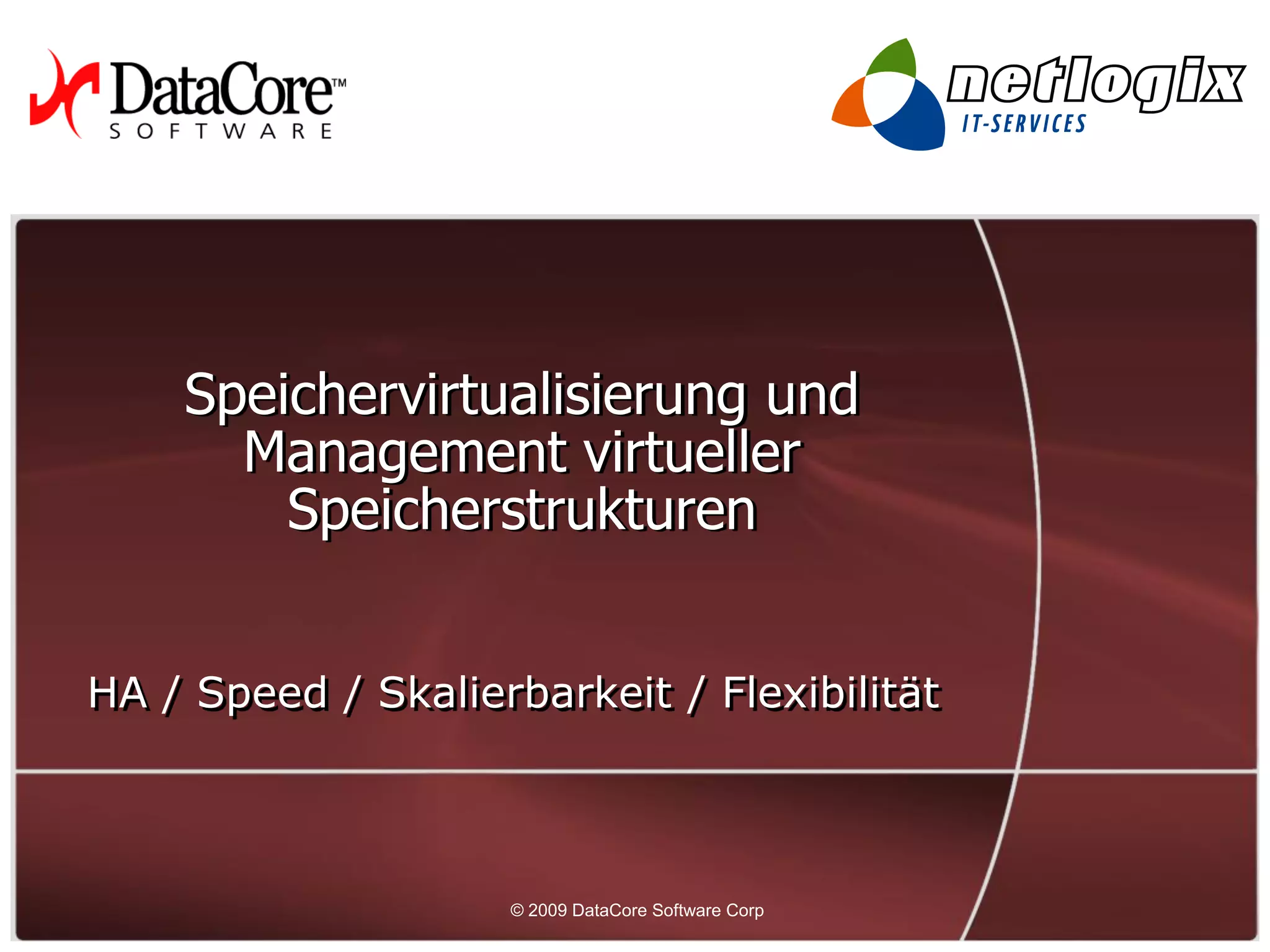 Das Dokument behandelt die Vorteile der Speichervirtualisierung und des Managements virtueller Speicherstrukturen, einschließlich erhöhter Geschwindigkeit, Flexibilität und Skalierbarkeit. Es hebt die Vorteile der Nutzung von Datacore-Software hervor, um Probleme wie Hardwareausfälle, teure Upgrades und ineffiziente Speichernutzung zu vermeiden. Zusätzlich werden Funktionen wie synchrones Mirroring, kontinuierlicher Datenschutz und Disaster Recovery sowie die Möglichkeit zur nahtlosen Migration zwischen Speichersystemen diskutiert.