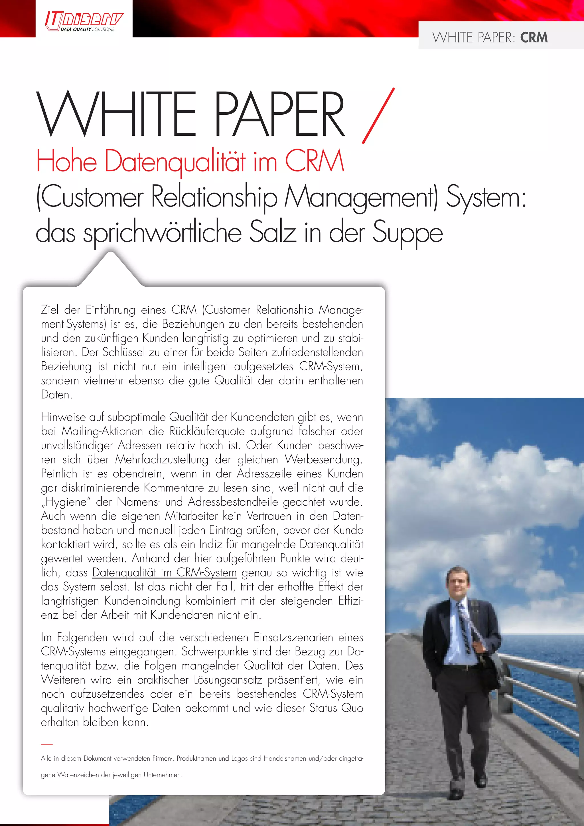 Das White Paper diskutiert die Bedeutung hoher Datenqualität im CRM-System zur Optimierung und Stabilisierung von Kundenbeziehungen, da fehlerhafte Daten zu einer hohen Rückläuferquote und unzufriedenen Kunden führen können. Es werden Praktiken zur Datenbereinigung und -pflege vorgestellt, um sicherzustellen, dass die Informationen im CRM korrekt und konsistent sind. Zudem wird der Zusammenhang zwischen Datenqualität und Mitarbeitermotivation betont, da qualitativ hochwertige Daten die Effizienz im Kundenmanagement erhöhen.