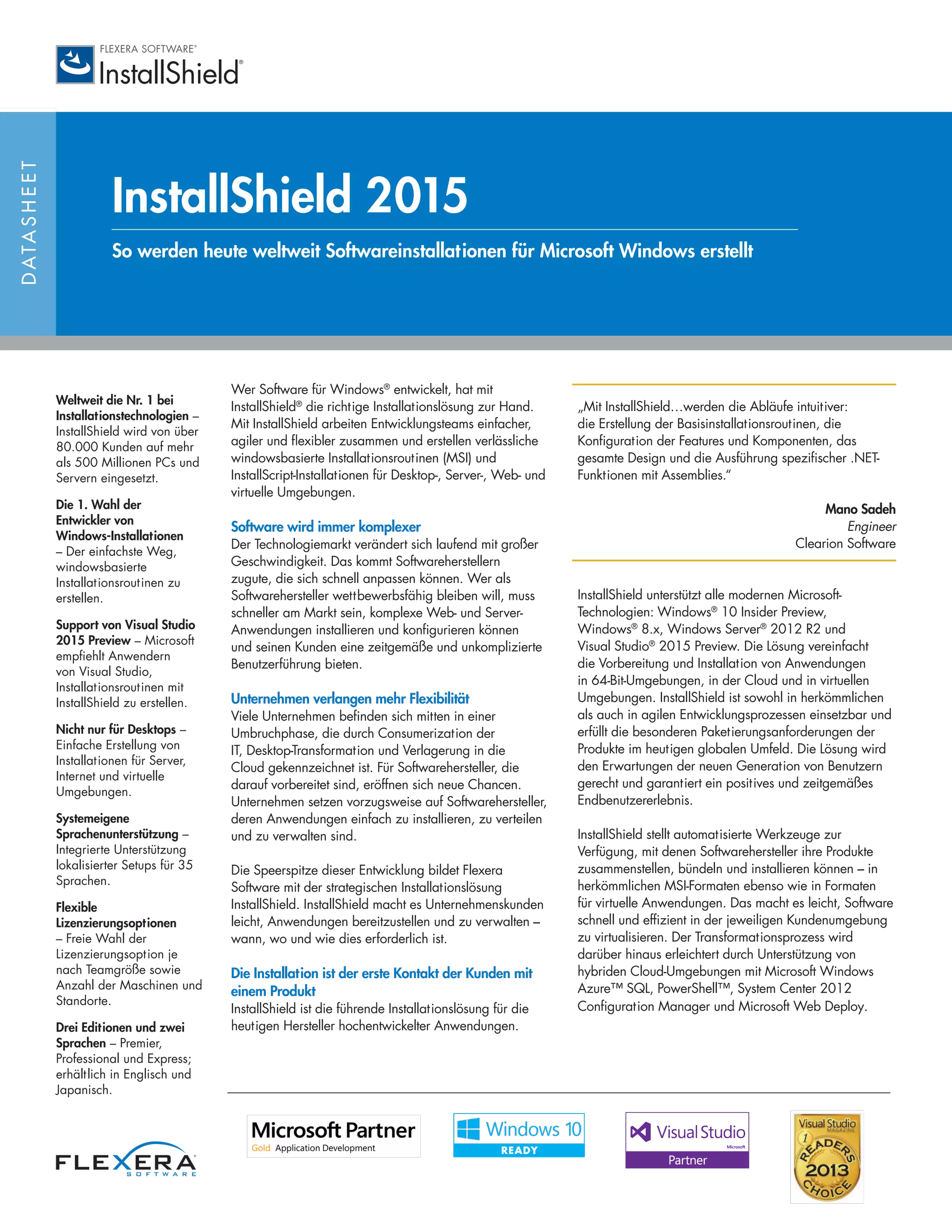 InstallShield 2015 ist eine umfassende Installationslösung für Microsoft Windows, die es Entwicklungsteams ermöglicht, schnell und effizient Softwareinstallationen für verschiedene Umgebungen zu erstellen. Die Lösung unterstützt moderne Microsoft-Technologien, umfasst Funktionen für die Automatisierung und vereinfacht die Installation und Verwaltung komplexer Anwendungen in hybriden Cloud-Umgebungen. Mit über 80.000 Kunden weltweit gilt InstallShield als der Branchenstandard für Installationslösungen.