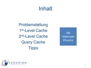 Das Dokument befasst sich mit der Optimierung des Datenbankzugriffs durch Caching am Application-Server, insbesondere mit 1st-Level- und 2nd-Level-Caches in JPA und Hibernate. Es werden verschiedene Lösungsansätze zur Problematik der Datenbanküberlastung und die Herausforderungen der Synchronisation bei Caching-Implementierungen thematisiert. Nutzungstipps und technische Details zur Einrichtung von Caches werden ebenfalls bereitgestellt.