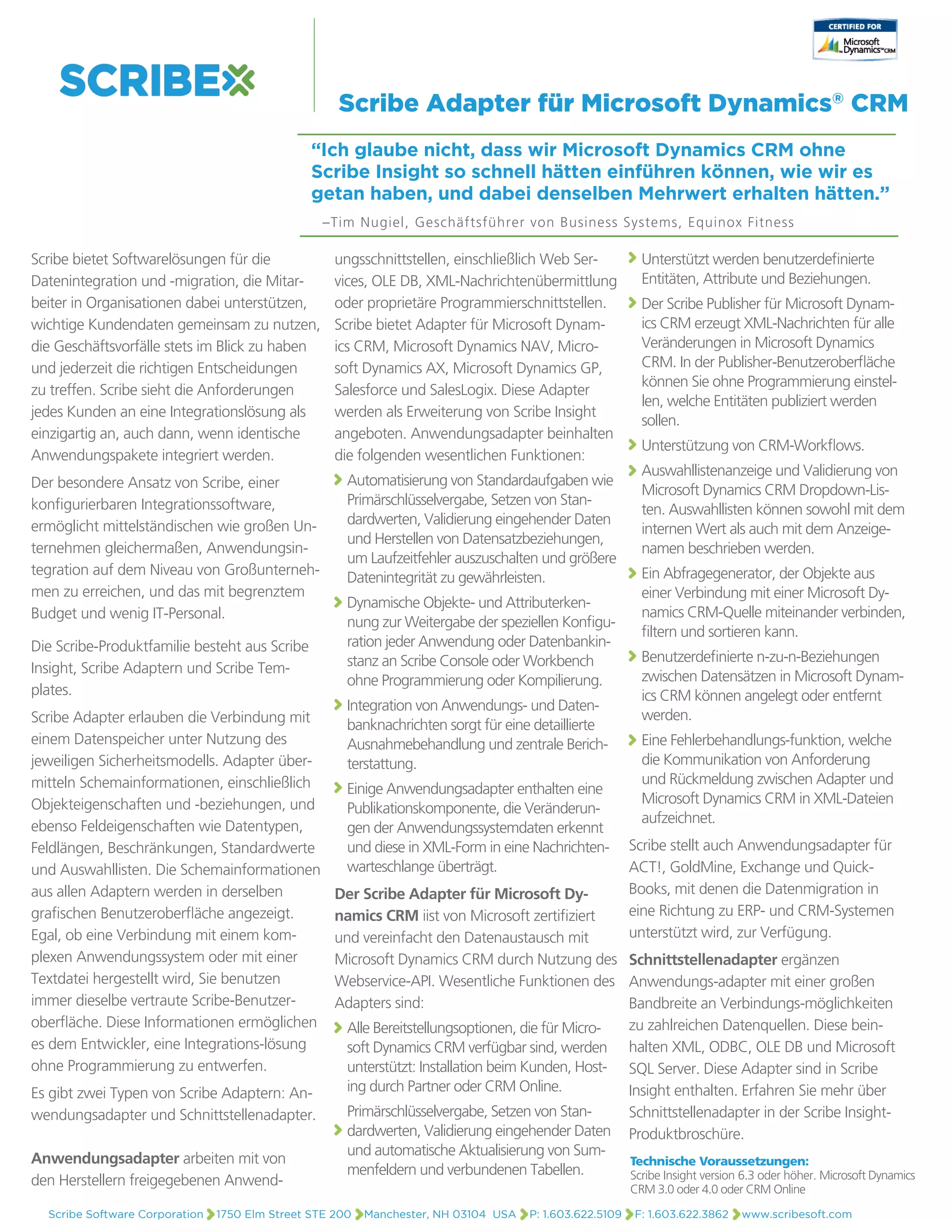 Scribe bietet Integrationslösungen für Microsoft Dynamics CRM, die eine benutzerfreundliche Datenintegration und -migration ermöglichen. Die Software unterstützt verschiedene Anwendungsadapter, erleichtert die Automatisierung standardisierter Aufgaben und gewährleistet die Datenintegrität durch eine umfangreiche Fehlerbehandlungsfunktion. Scribe-Adapter können ohne Programmierung konfiguriert werden und sind zertifiziert, um eine nahtlose Verbindung zu verschiedenen Datenquellen herzustellen.