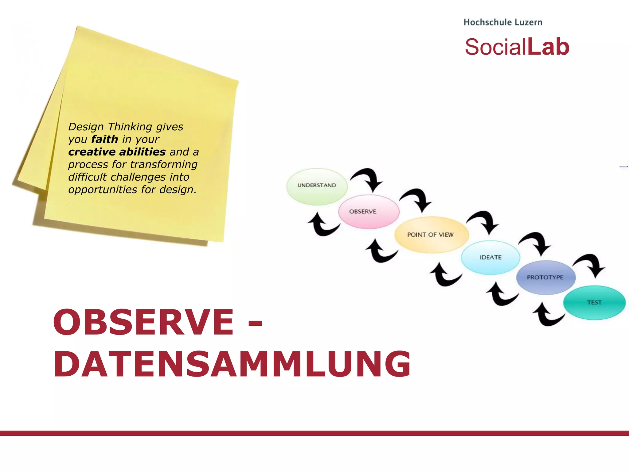 Das Dokument beschreibt den Prozess des Design Thinkings im Kontext des Social Labs und betont die Bedeutung der kreativen Fähigkeiten zur Umwandlung von Herausforderungen in Designmöglichkeiten. Es umfasst die Planung der Datensammlung, die Identifikation von Zielgruppen, die Durchführung von Interviews und die Analyse von Bedürfnissen anhand verschiedener Methoden. Zudem wird auf die Erstellung eines Projektplans und die Strukturierung von Aufgaben hingewiesen.