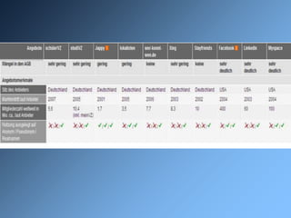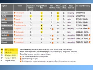 Das Dokument behandelt die Datenschutzproblematik in sozialen Online-Netzwerken, die von einem signifikanten Anteil der Deutschen, insbesondere Jugendlichen, genutzt werden. Es zeigt erhebliche Mängel beim Datenschutz auf und hebt hervor, wie leicht Hacker an persönliche Daten gelangen können. Das Bundesamt für Sicherheit in der Informationstechnik gibt Empfehlungen zur Verbesserung des Datenschutzes, während zahlreiche Diskussionen zu Nutzerrechten, Jugendschutz und den Risiken von Social Bots erfolgen.
