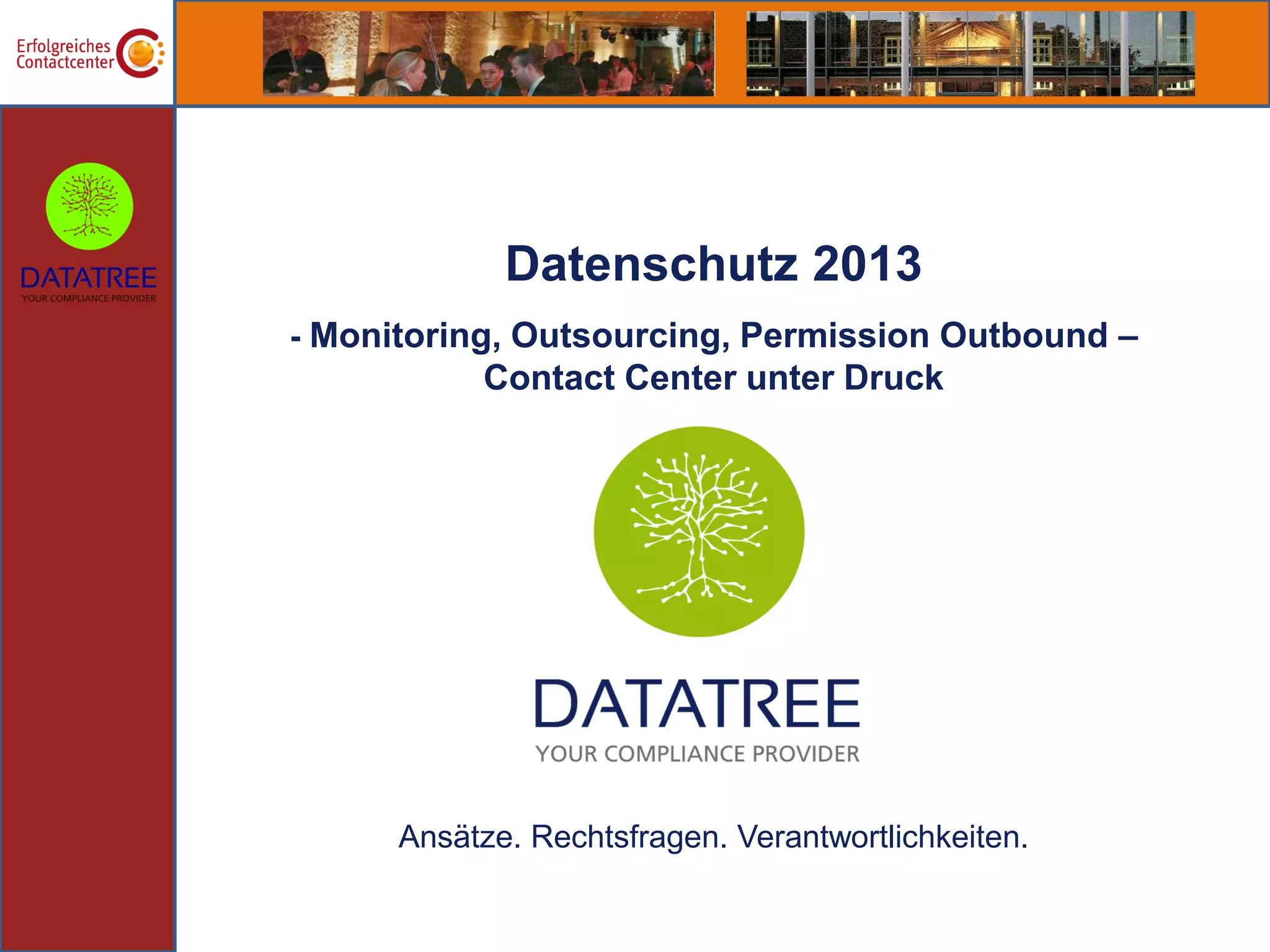 Das Dokument behandelt Datenschutzaspekte im Kontext von Permission Marketing, Outsourcing und Monitoring in Call Centern, einschließlich der rechtlichen Anforderungen an die Einwilligung (Opt-in) sowie der Besonderheiten bei der Auftragsverarbeitung. Es werden wichtige Informationen zu den Bedingungen für gültige Einwilligungen gegeben und auf die Notwendigkeit hingewiesen, regelmäßige Kommunikation zur Aufrechterhaltung der Einwilligung zu führen. Zudem wird ein Ausblick auf zukünftige Veränderungen im Datenschutzrecht gegeben, die internationale Unternehmen betreffen werden.