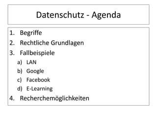 Das Dokument behandelt die Grundlagen des Datenschutzes und der Datensicherheit, einschließlich rechtlicher Bestimmungen wie dem Datenschutzgesetz von 2003 sowie spezifischen Richtlinien der EU. Es erläutert die Bedeutung des Datenschutzes als Schutz der Rechte von Individuen und die notwenigen Maßnahmen zur Gewährleistung der Datensicherheit. Zudem werden Fallbeispiele und administrative Verfahren zur Einhaltung des Datenschutzes vorgestellt.