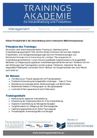 Das Dokument beschreibt ein zweitägiges Training zur Optimierung der Instandhaltungsorganisation, das am 12.-13.03.2014 oder 15.-16.10.2014 in München stattfindet und von Dipl.-Ing. Heino von Schuckmann geleitet wird. Teilnehmer lernen die Bedeutung der geplanten Instandhaltung, Methoden zur Steigerung des Planungsgrades sowie praktische Anwendungen und diskutieren Fallbeispiele. Die Teilnahmegebühr beträgt 1.190 Euro plus MwSt., wobei MFA-Mitglieder einen Rabatt erhalten.