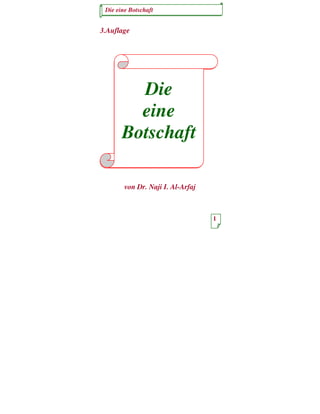Das Dokument beschreibt die zentrale Botschaft des Monotheismus, die von verschiedenen Propheten wie Adam, Noah, Abraham, Moses, Jesus und Muhammad verkündet wurde: Es gibt nur einen einzig wahren Gott, der verehrt werden sollte. Es wird betont, dass diese Botschaft in den Schriften der Juden, Christen und Muslime erkennbar ist und dass die Lehren dieser Propheten eine einheitliche religiöse Botschaft vermitteln. Zudem wird ein Aufruf zur ernsthaften Auseinandersetzung mit den Lehren und zur Annahme des Islams als wahre Religion ausgesprochen.
