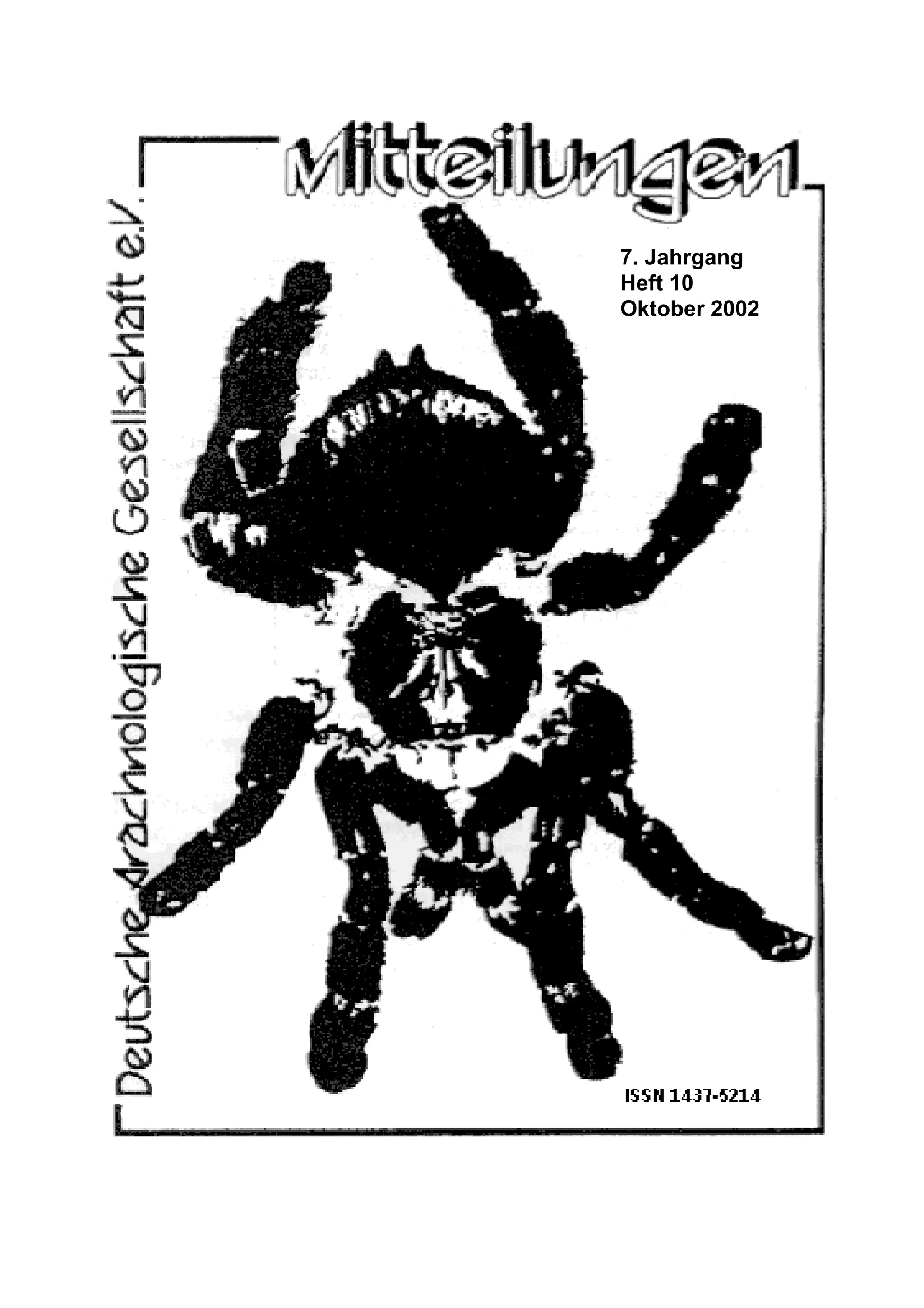 Die Vereinsnachrichten im Oktober 2002 enthalten Informationen über die Redaktionswechsel und die bevorstehenden Änderungen der Mitteilungen, die nun in einem zweimonatlichen Rhythmus erscheinen werden. Zudem werden Berichte über Reisen und Tierarten, insbesondere Spinnen, veröffentlicht, einschließlich der Beobachtungen und Untersuchungen zu Pisaura mirabilis sowie Spinnenarten auf Gran Canaria. Mitglieder können Kleinanzeigen und Berichte an die Redaktion senden und Informationen über Börsen und Termine veröffentlichen lassen.
