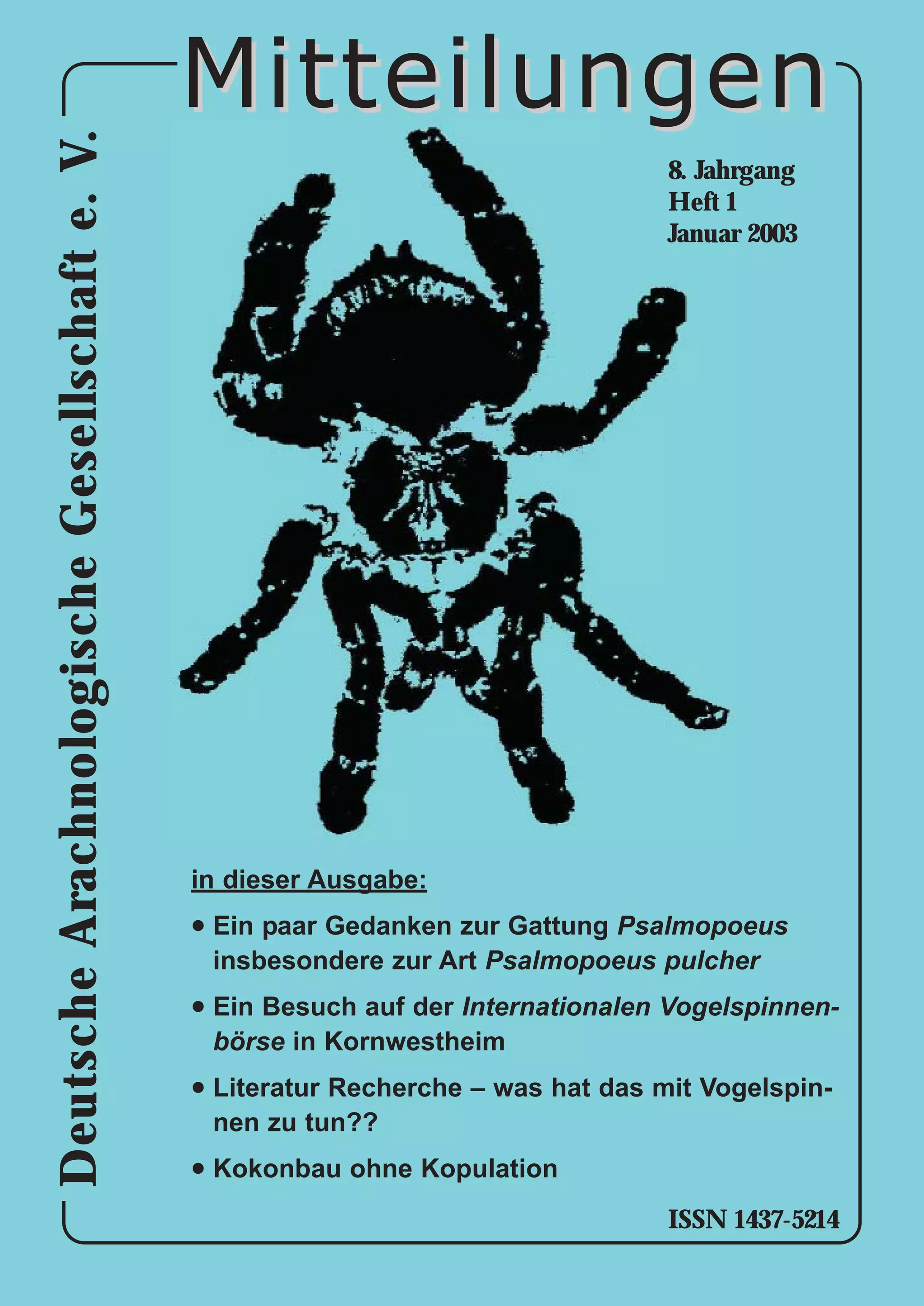 In der Januar-Ausgabe 2003 der Mitteilungen der Deutschen Arachnologischen Gesellschaft werden verschiedene Themen behandelt, darunter die Gattung Psalmopoeus und deren Arten wie Psalmopoeus pulcher, sowie Berichte von Besuchen auf der internationalen Vogelspinnenbörse. Weitere Artikel befassen sich mit der Literaturrecherche zur Vogelspinnenhaltung, dem Kokonbau ohne Kopulation und Kinderbuchvorstellungen. Die Veröffentlichung enthält auch Informationen zu Kleinanzeigen und Terminankündigungen für die Mitglieder der Gesellschaft.
