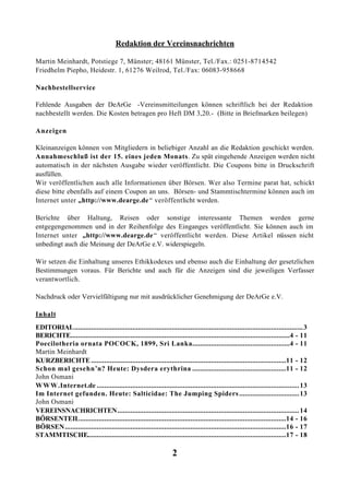 Das Dokument enthält die Vereinsnachrichten des DEARGE für Februar 2001, einschließlich Informationen über das Nachbestellen von Ausgaben, Kleinanzeigen und Artikel über Spinnen, insbesondere die Art Poecilotheria ornata aus Sri Lanka. Zudem werden Details zur Haltung, Zucht und dem Verhalten dieser Vogelspinnenart bereitgestellt, einschließlich ihrer Aggressivität und spezifischen Bedürfnisse im Terrarium. Zudem werden Vorschriften zur Einsendung von Berichten und Anzeigen sowie Informationen über die Gestaltung des Vereinsheftes gegeben.