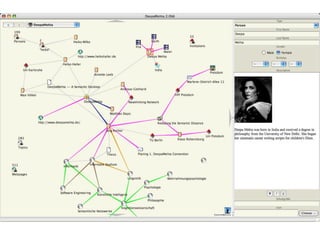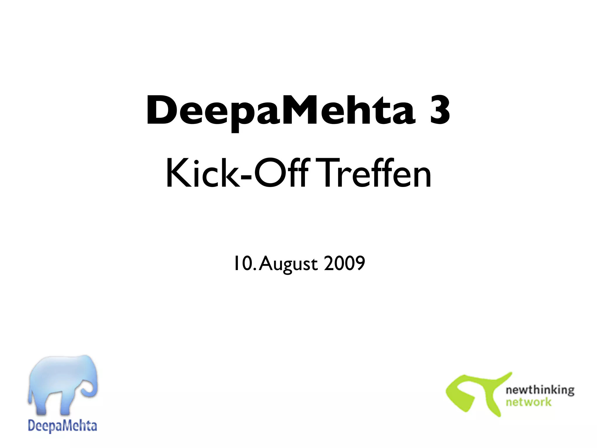 Das Dokument beschreibt das Kick-off-Treffen für deepamehta 3 am 10. August 2009, das mehrere Ziele wie die Stärkung des Community-Prozesses und das Lernen von Best Practices umfasst. Es werden auch Erkenntnisse aus der vorherigen Version deepamehta 2 sowie relevante Innovationsfaktoren und persönliche Vorbildprojekte präsentiert. Zudem wird der Designprozess von Bill Verplank und die Entwicklungstechnologie von David Liddle thematisiert.
