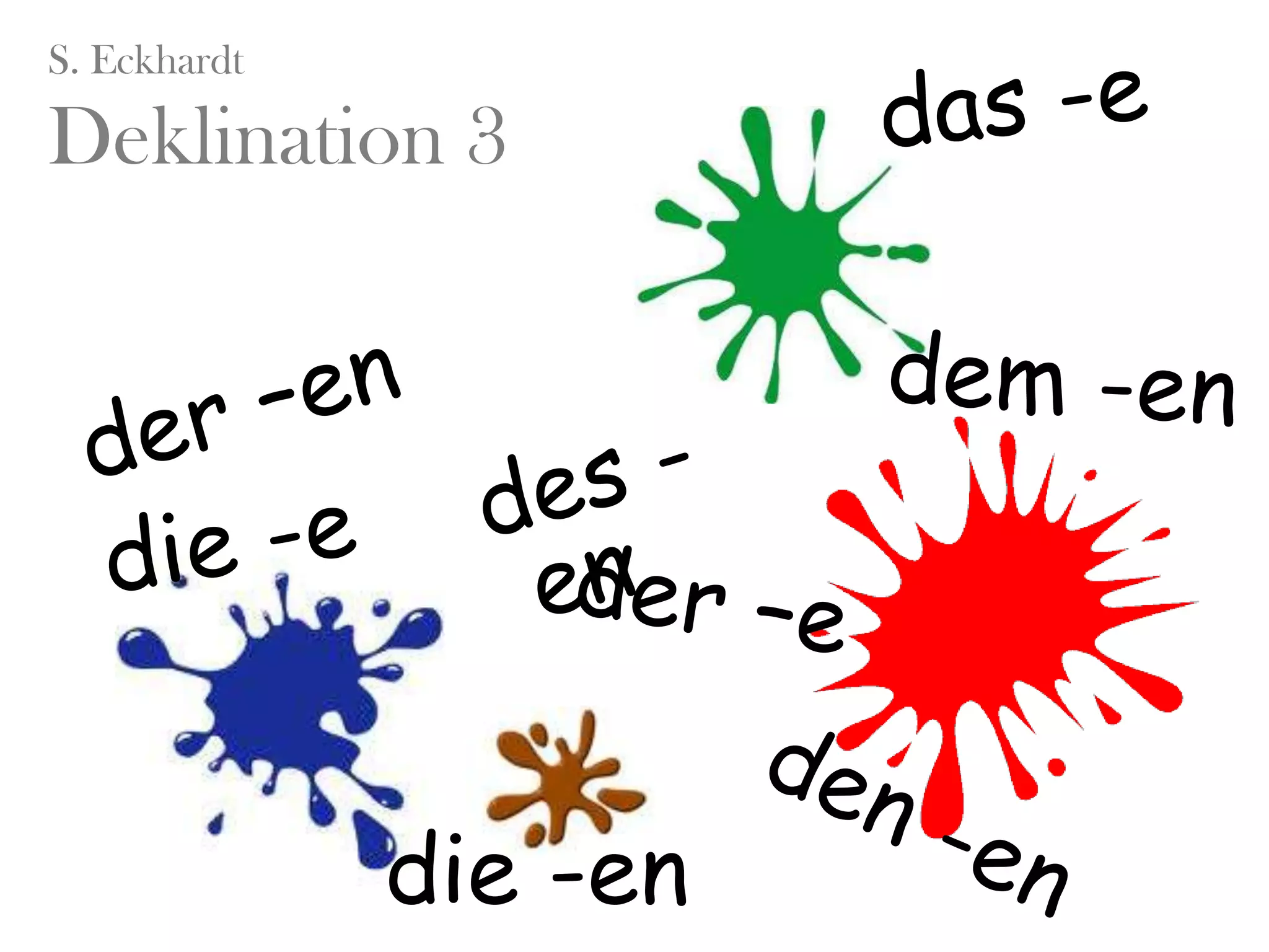 Das Dokument behandelt die Deklination von Adjektiven im Deutschen, einschließlich ihrer Endungen für verschiedene grammatische Geschlechter und Fälle. Es liefert Beispiele für die Verwendung von Adjektiven in Sätzen mit Nomen in unterschiedlichen Formen. Zudem wird auf spezifische grammatikalische Regeln und deren Anwendung hingewiesen.