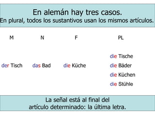 Das Dokument behandelt die Deklination im Deutschen, insbesondere die drei grammatikalischen Fälle: Nominativ, Akkusativ und Dativ, sowie deren Artikel und Pronomen für die verschiedenen Geschlechter im Singular und Plural. Es wird erklärt, wie die Artikel in jedem Fall verändert werden und welche grammatikalischen Funktionen die jeweiligen Fälle haben. Zudem werden die spezifischen Endungen und Markierungen für männlich, weiblich und neutral sowie für den Plural vorgestellt.