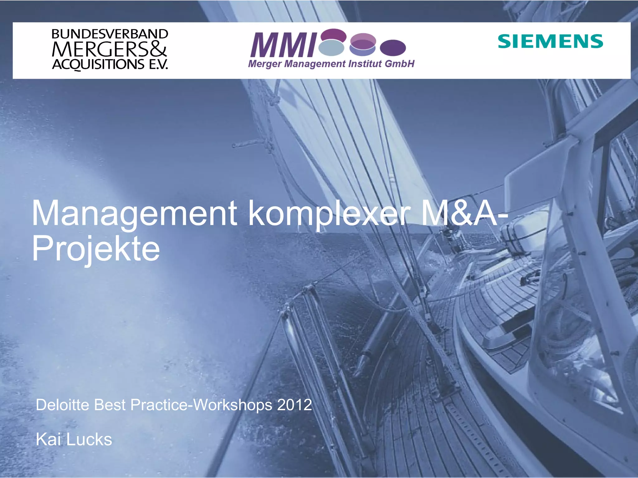 Das Dokument behandelt das Management komplexer M&A-Projekte und beleuchtet die Herausforderungen und Erfolgsquoten solcher Vorhaben. Es werden grundlegende Treiber der Komplexität identifiziert und ein Referenzprojekt-Modell von Siemens vorgestellt, das einen strukturierten Prozessansatz für die Projektführung beschreibt. Zudem wird die Bedeutung von Wissensmanagement und Erfahrungstransfer für den Erfolg von M&A-Projekten hervorgehoben.