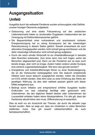 Die aktuelle Wirtschaftslage, geprägt von der Pandemie, hat strukturelle Mängel wie Lieferengpässe, Arbeitskräftemangel und eine Energiekrise offenbart, was Unternehmen zwingt, ihre Strategien zu überdenken. Es wird empfohlen, kurzfristig den Cash-Flow zu sichern und mittel- bis langfristig Szenarien zu entwickeln, um zukunftsorientierte Resilienz zu gewährleisten. Unternehmen sollten ihre Kernstärken herausarbeiten, Technologien weiterentwickeln und alternative Beschaffungsquellen prüfen, um den Herausforderungen des Marktes besser zu begegnen.