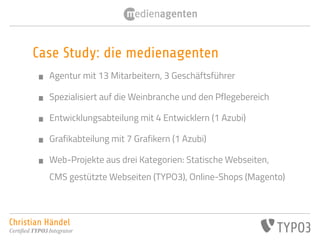 Die Fallstudie beschreibt die Transformation einer Medienagentur durch die Implementierung standardisierter Entwicklungs- und Deployment-Methoden für TYPO3-Projekte, einschließlich der Umstellung von SVN auf Git und der Optimierung von Arbeitsabläufen. Es werden Probleme wie hohe Fluktuation im Entwicklerteam und Schwierigkeiten bei der Zusammenarbeit angegangen, während automatisierte Prozesse und einheitliche Entwicklungsumgebungen Vorteile bieten. Schließlich wird betont, dass effektives Deployment eine grundlegende Voraussetzung für erfolgreiche Projektmanagement-Strategien ist.