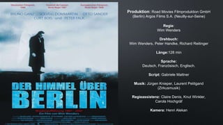 Der Film 'Der Himmel über Berlin', unter der Regie von Wim Wenders, erzählt die Geschichte von zwei Engeln, Damiel und Cassiel, die das Leben der Menschen in Berlin aus einer schwarz-weißen Perspektive beobachten. Die Engeln können den Menschen nicht direkt helfen, jedoch gibt Damiel, der sich in die Trapezkünstlerin Marion verliebt, seine Unsterblichkeit auf, um Mensch zu werden und das Leben in voller Farbe zu erleben. Der Film wurde mehrfach ausgezeichnet, darunter die Palme d'Or beim Festival de Cannes 1987, und inspirierte die Neuverfilmung 'City of Angels' im Jahr 1998.