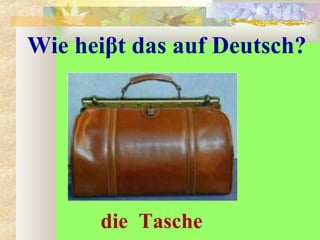 Das Dokument stellt eine Liste von Gegenständen in deutscher Sprache zusammen und fragt wiederholt nach deren Namen. Es umfasst verschiedene Schulsachen, Möbel und elektronische Geräte. Die Wiederholung der Frage 'Wie heißt das auf Deutsch?' verdeutlicht die Lernabsicht über die deutsche Sprache.