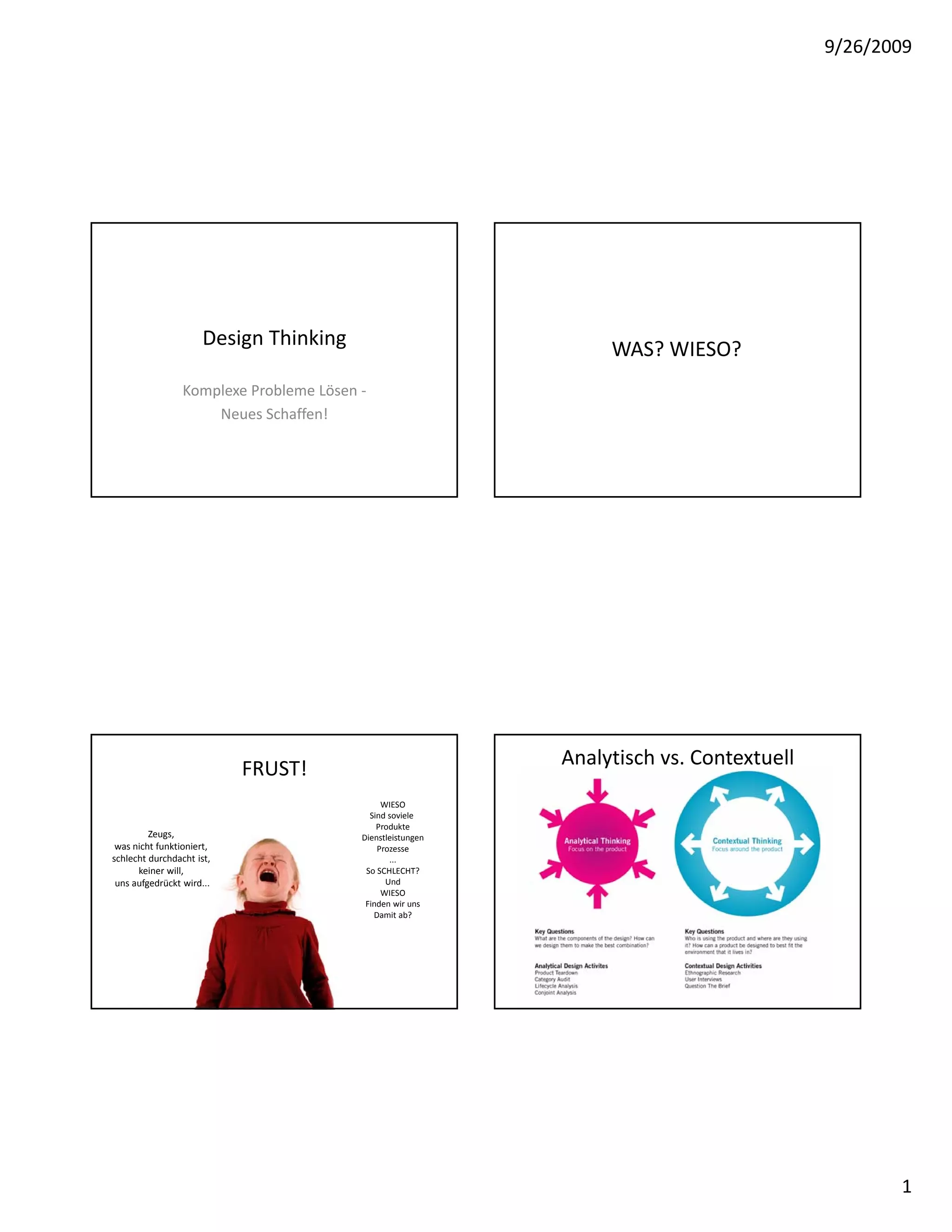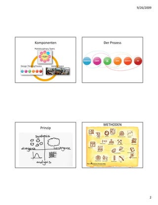 Das Dokument thematisiert Design Thinking als Ansatz zur Lösung komplexer Probleme und zur Schaffung neuer Produkte und Dienstleistungen. Es kritisiert die Unzulänglichkeiten bestehender Produkte und Prozesse und verweist auf die Notwendigkeit eines kontextuellen Denkens. Der Prozess umfasst Komponenten wie Recherche, Prototyping und ein Lernen durch Handeln.