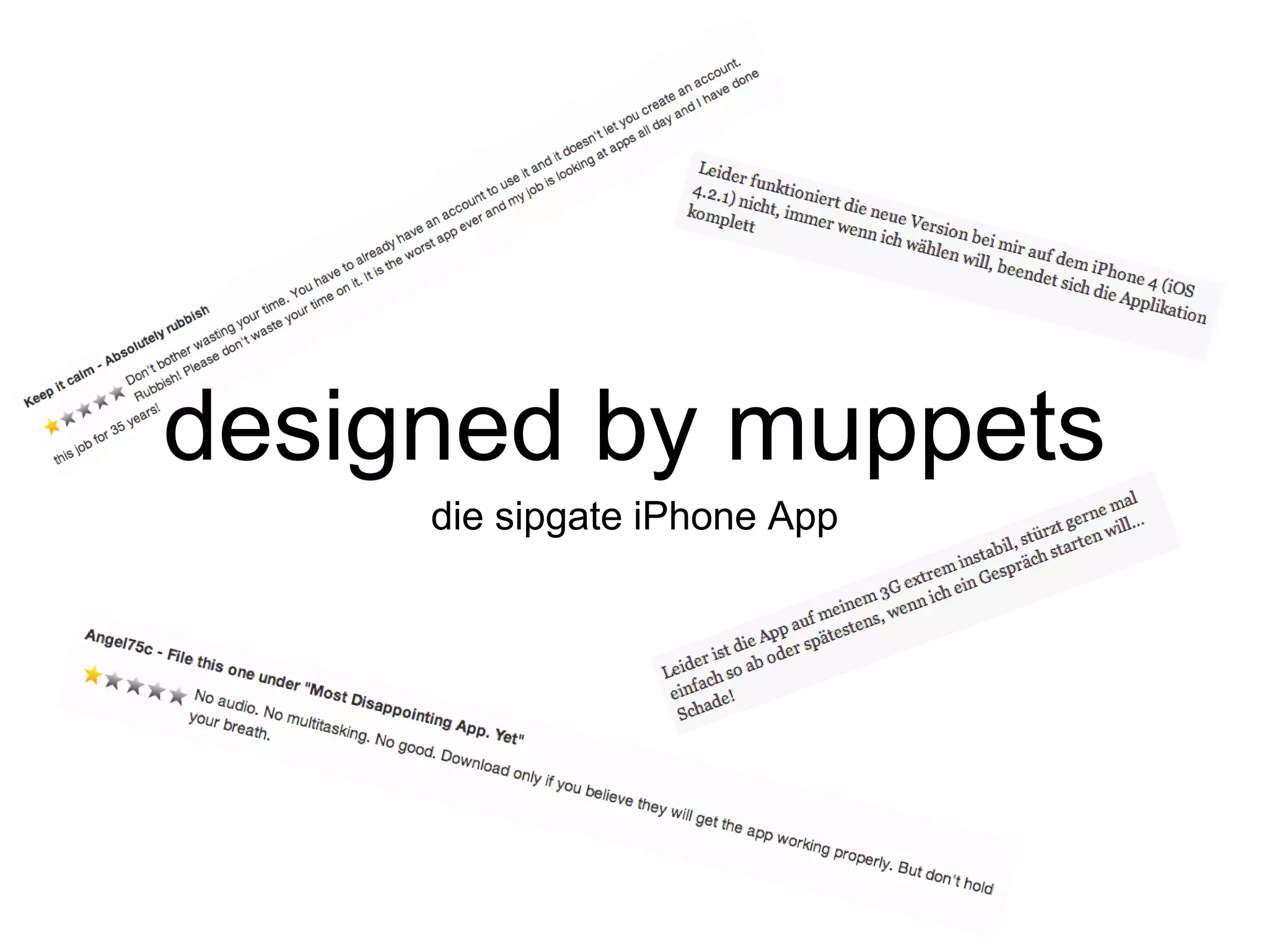 Die sipgate iPhone App wurde unter der Leitung von Muppets entworfen. Das Projekt befasste sich mit spezifischen Herausforderungen, die während der Entwicklung auftraten, und analisiert, was das Team dabei gelernt hat. Zudem werden Überlegungen angestellt, was im Nachhinein anders gemacht werden könnte.