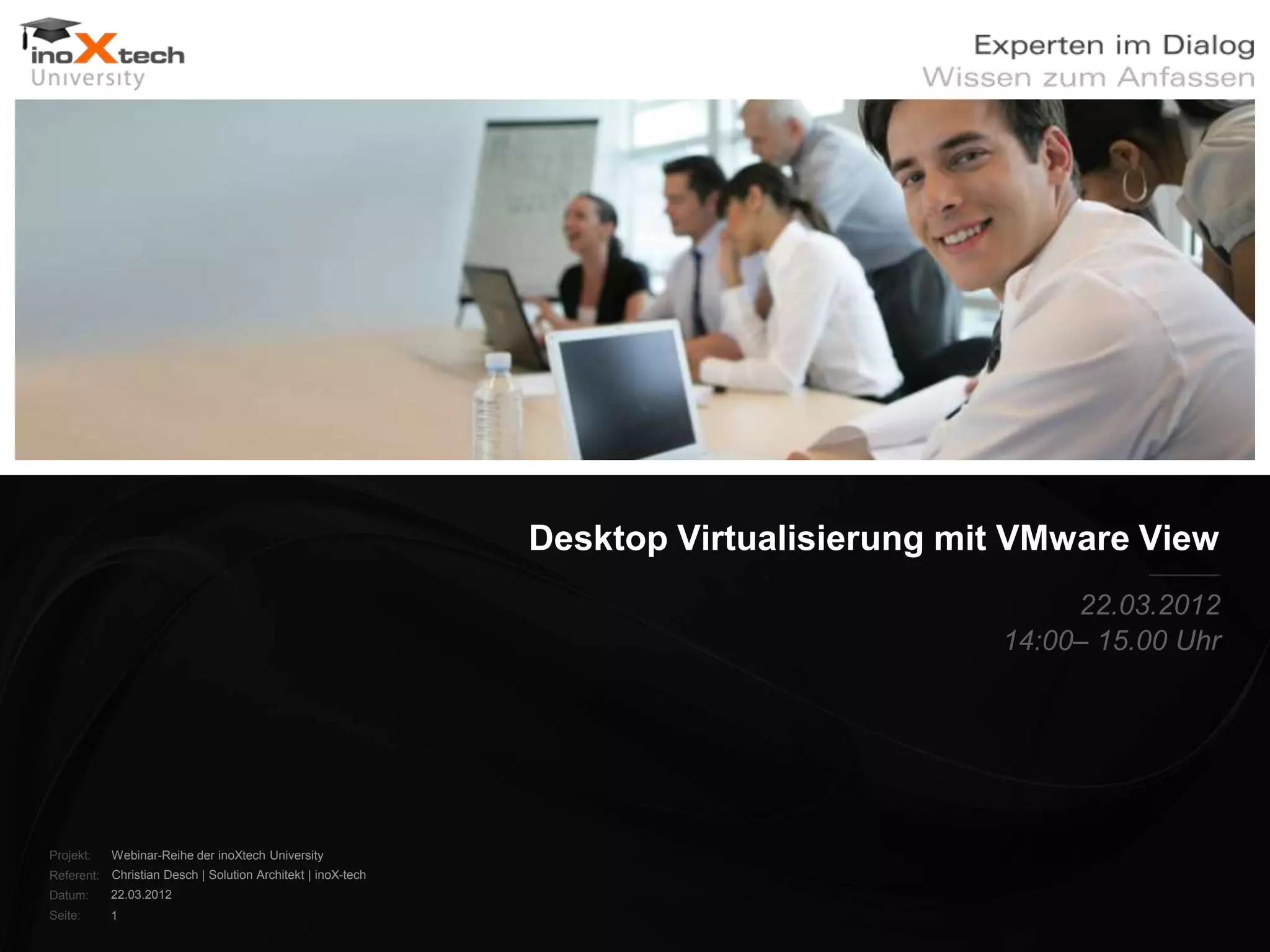 Das Dokument beschreibt eine Webinar-Reihe der Inoxtech University, die sich mit Desktop-Virtualisierung mithilfe von VMware View befasst. Die Agenda umfasst Themen wie Architektur, Management und Anwendung von VMware View sowie die Stärkung der IT-Community durch Wissensaustausch und Fachgespräche. Es wird betont, wie die Teilnehmer durch die Webinare einen Wissensvorsprung erlangen und zukunftsweisende Technologien kennenlernen können.