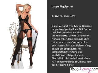 Der Modeshop mode-lounge.com präsentiert eine neue Dessous-Kollektion, die eine Vielzahl von verführerischen Kleidungsstücken wie Negligés, Teddy und Bustier umfasst, alle aus hochwertigen Materialien wie Tüll und Spitze gefertigt. Jedes Produkt wird durch besondere Details wie Schmuckketten und Strumpfbänder ergänzt und bietet eine angenehme Passform. Die Kollektion enthält auch spezielle Funktionen wie verstellbare Straps und eine Vielzahl von Zahlungsoptionen sowie einen Kundenservice.