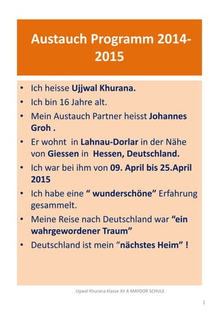 Ujjwal Khurana beschreibt seine Erfahrungen während eines Austauschprogramms in Deutschland von April 2015. Er besuchte zahlreiche Städte und Sehenswürdigkeiten und verbrachte viel Zeit mit seiner Gastfamilie, die ihn herzlich aufnahm. Ujjwal schätzte die Pünktlichkeit und Fitness der Deutschen sowie ihre wertvolle Freizeitgestaltung und zeigte Interesse am deutschen Bildungssystem.