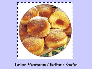 Das Dokument listet verschiedene traditionelle deutsche Gerichte auf, darunter Berliner Pfannkuchen, Käsefondue, Wiener Schnitzel und Schwarzwälder Kirschtorte. Es vermittelt eine kulinarische Vielfalt aus verschiedenen Regionen Deutschlands. Die Aufzählung endet mit einem positiven Wunsch nach 'Guten Appetit!'.