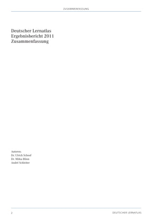 Der Ergebnisbericht 2011 des Deutschen Lernatlas zeigt, dass es erhebliche regionale Unterschiede beim lebenslangen Lernen in Deutschland gibt, wobei ein deutliches Süd-Nord-Gefälle zu beobachten ist. Insbesondere schneiden die südlichen Bundesländer in den Bereichen schulisches, berufliches, soziales und persönliches Lernen besser ab als die nördlichen. Zudem identifiziert der Bericht sogenannte 'Hidden Champions', bei denen die Lernbedingungen besser sind als die wirtschaftliche Lage es vermuten lässt.