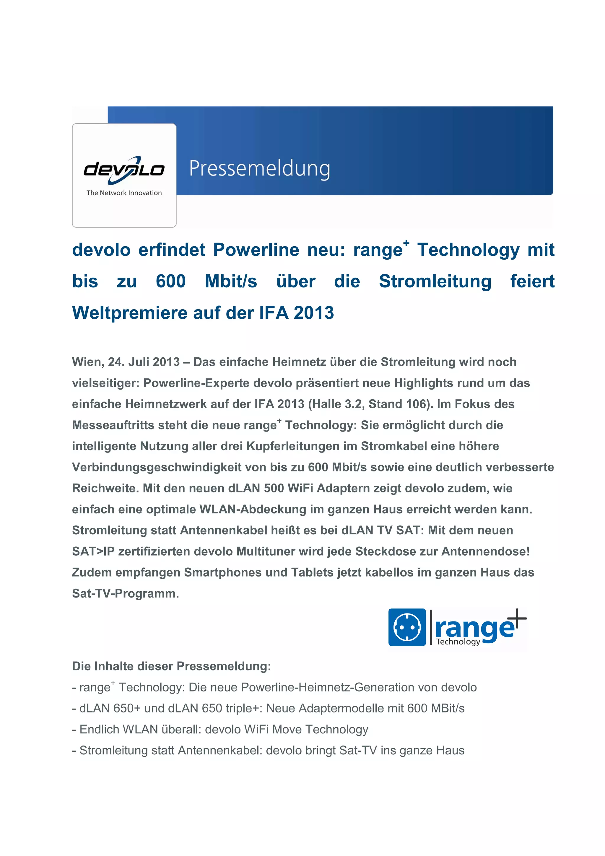 Devolo präsentiert auf der IFA 2013 die neue Range+ Technology, die durch die Nutzung aller drei Kupferleitungen in Stromkabeln Datenübertragungsraten von bis zu 600 Mbit/s ermöglicht und eine verbesserte Reichweite bietet. Mit neuen Adaptern wie dem dLAN 650+ und dem dLAN 650 triple+ sowie der WiFi Move Technology wird eine umfassende WLAN-Abdeckung für Smartphones und Tablets realisiert. Zudem ermöglicht der neue dLAN TV Sat Multituner den Empfang von Sat-TV über das Stromnetz, wodurch jede Steckdose zur Antennendose wird.