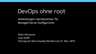 Der Vortrag von Peter Hormanns behandelt die Konfiguration von DevOps-Anwendungen ohne Root-Zugriff auf verwalteten Servern, wobei Ansible für das Konfigurationsmanagement genutzt wird. Es werden Vorteile der Nutzung von Managed-Servern in einem datenschutzkonformen Umfeld und praktische Ansible-Beispiele wie Playbooks und Module vorgestellt. Die Lektionen aus der Praxis heben die Wichtigkeit von Rollen und idempotenten Prozessen hervor sowie die kontinuierlichen Verbesserungen, die Ansible 2 bietet.