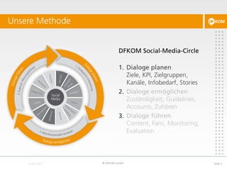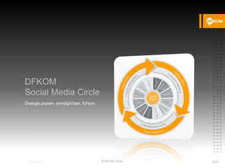 Das Dokument beschreibt den 'dfkom Social Media Circle' als Methode zur Planung, Ermöglichung und Durchführung von Dialogen in sozialen Medien. Es legt Ziele und KPIs für Unternehmenskommunikation und Personalwesen fest, erörtert die Auswahl und den Nutzen verschiedener Kanäle wie Twitter, Facebook und YouTube und betont die Wichtigkeit von Social Media Guidelines sowie Zuständigkeitsregelungen. Der Prozess umfasst die Schritte des Planens, Ermöglichen und Führens von Dialogen, um die Kommunikation und Interaktionen mit Zielgruppen zu optimieren.